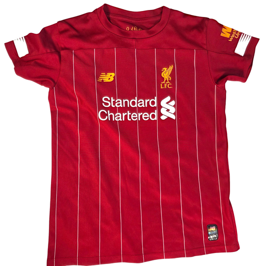 Liverpool 2019/20 Home Football Kit by New Balance. Includes red home shirt and matching shorts with pinstripe design, Standard Chartered sponsor and Liverpool FC crest from the iconic title-winning season. Great condition – one tiny mark on the back of the shirt (see photos) Boys Size 6-7 Years Genuine New...