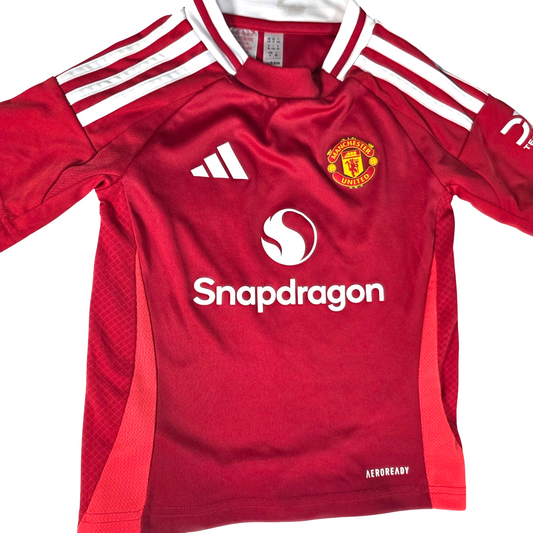 Excellent Condition - Small mark on inside of collarManchester United home football kit from the 2024/25 season by adidas, featuring the classic red shirt with Snapdragon sponsor and matching white shorts with club crest. A fresh modern United kit, perfect for young fans on match days or everyday wear. ✔...