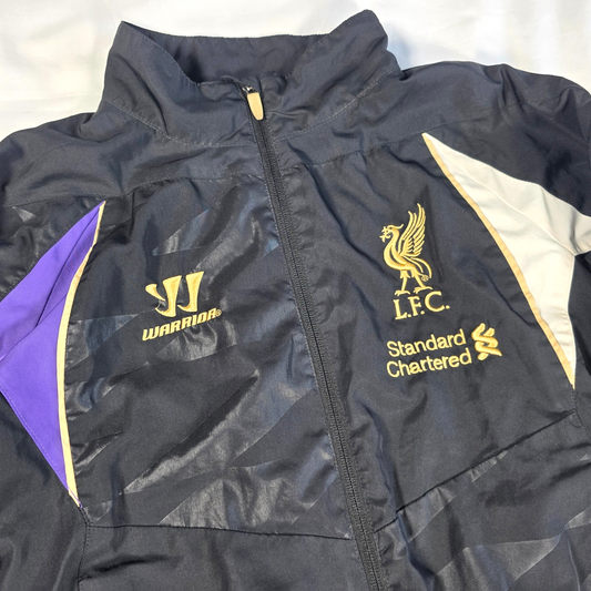 Liverpool FC 2013/14 Track Jacket by Warrior. Lightweight full zip jacket in black with gold LFC crest and Warrior branding, featuring purple and grey panel detailing for a classic training look from the 2013/14 season. Excellent condition Boys Size 9–10 Years Genuine Warrior Liverpool jacket Ideal for training, football practice...