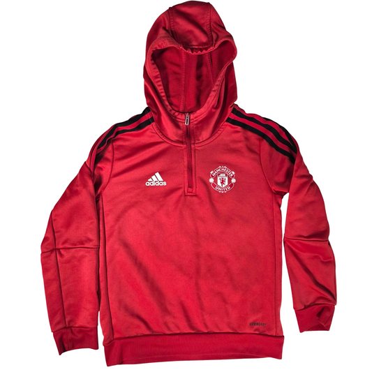 Good Condition – tiny hole in the sleeve (shown in photos)Manchester United hooded training top by adidas, featuring the classic red design with 1/4 zip hood, black shoulder stripes and embroidered club crest. Ideal for training, football sessions or everyday wear. ✔ Good Condition – tiny hole in the sleeve...