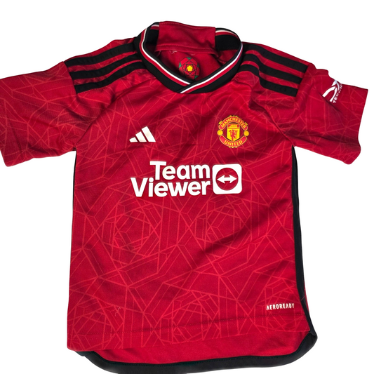 Excellent Condition - Size tag removed from shirt Manchester United home football kit from the 2023/24 season by adidas, featuring the classic red home shirt with TeamViewer sponsor and matching white shorts with club crest. A great full kit for young United fans, ideal for match days or everyday wear....