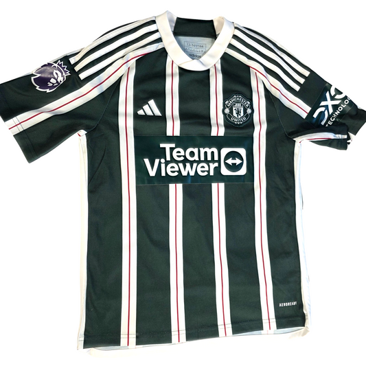 Excellent Condition Manchester United away football kit from the 2023/24 season by adidas, featuring the dark green striped away shirt with TeamViewer sponsor and matching black shorts. Includes #6 Sánchez, making it a great full kit for young United fans. ✔ Excellent Condition ✔ Size: 13–14 Years ✔ Genuine Manchester...