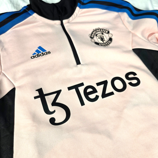 Good Condition - Mark on the sleeveManchester United Condivo training top by adidas, featuring the light pink design with black and blue detailing, 1/4 zip neck, Tezos sponsor and club crest. Ideal for training, football sessions or casual wear. ✔ Good Condition – mark on the sleeve ✔ Size: 11–12...