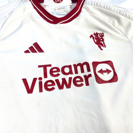 Excellent conditionManchester United 2023/24 third football shirt by adidas, featuring the clean white design with red detailing, TeamViewer sponsor, club crest and Aeroready fabric. Ideal for matchdays, training or casual wear.