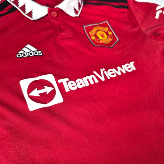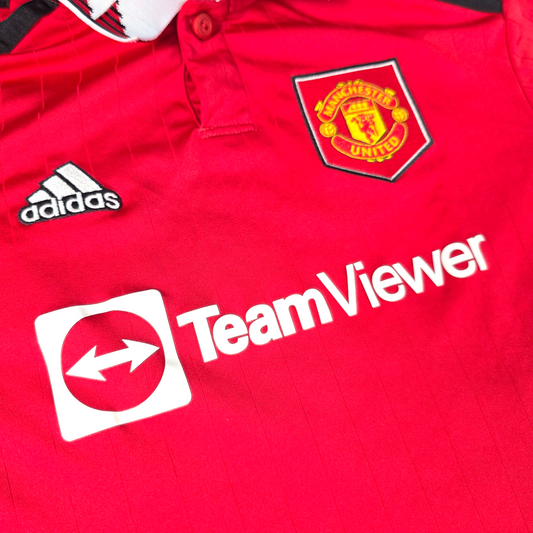 Excellent ConditionManchester United home football shirt from the 2022/23 season by adidas, featuring the classic red design with black shoulder stripes, TeamViewer sponsor and embroidered club crest. Perfect for match days, training or everyday wear.