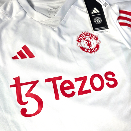 Manchester United training shirt from the 2023 to 2024 season by adidas, featuring the clean white design with red detailing, Tezos sponsor and embroidered club crest. Lightweight and breathable, ideal for training sessions or everyday wear. ✔ New with tags ✔ Size: 9 to 10 Years ✔ Genuine Manchester United...