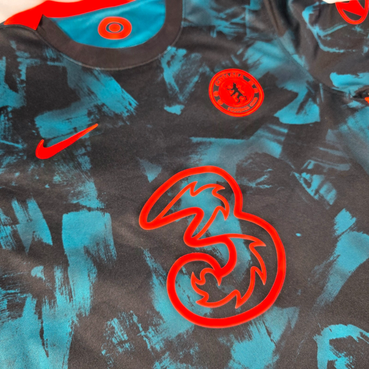 Excellent ConditionNike Chelsea FC third football shirt from the 2021/22 season by Nike, featuring the striking black and teal brush-stroke design with bright orange detailing, club crest, Nike swoosh and large “3” sponsor on the front. A bold and modern kit, perfect for matchdays, training or casual wear. ✔ Excellent...