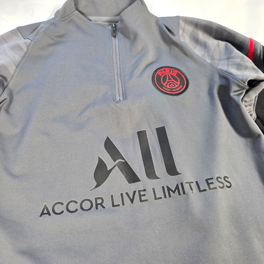 Paris Saint-Germain Strike drill top by Nike, featuring a sleek grey design with subtle patterned sleeves, 1/4 zip neck, PSG crest and ALL sponsor. Lightweight and ideal for training sessions or everyday sportswear.