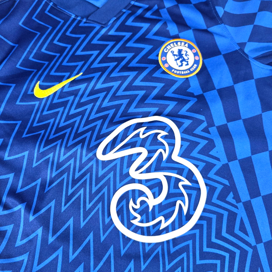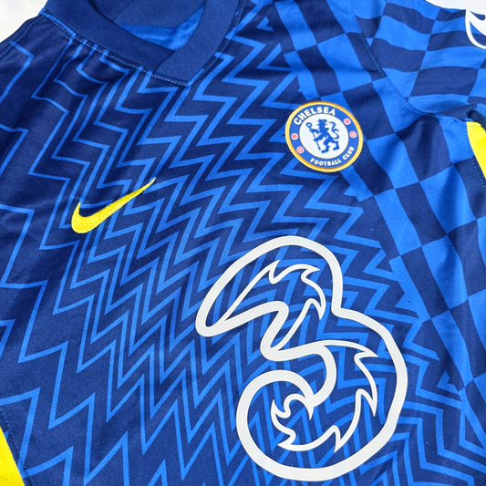 This official Nike Chelsea FC home shirt features the bold 2021/22 zig-zag and checkerboard design, club crest, and sponsor detailing — perfect for young Blues fans and collectors.