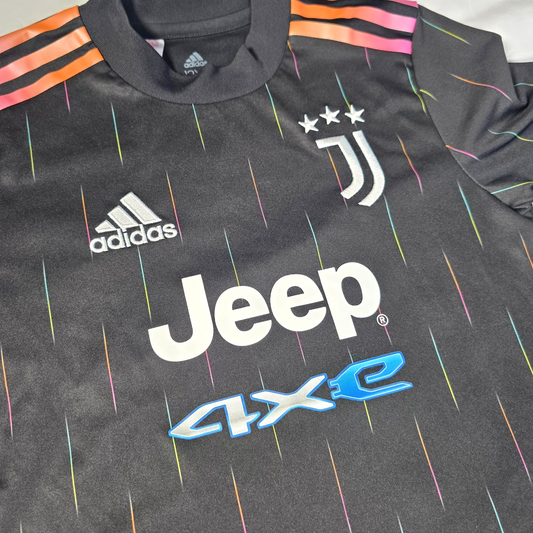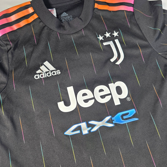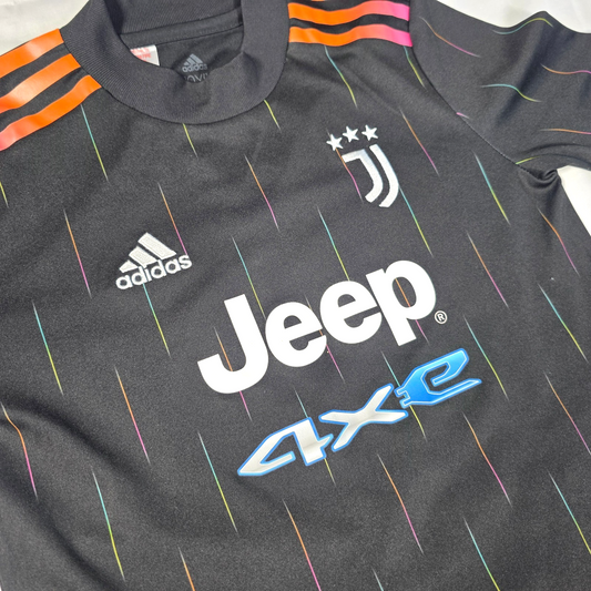 Excellent ConditionJuventus away shirt by Adidas from the 2021 to 2022 season featuring a sleek black design with multicolour detailing, iconic Jeep sponsor and embroidered club crest. Lightweight AEROREADY fabric makes it ideal for match days, training or everyday wear. ✔ Excellent Condition ✔ Size: 9 to 10 Years ✔...