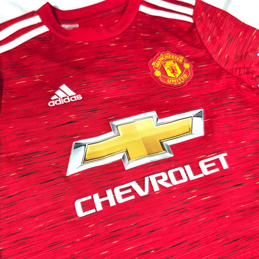 Excellent ConditionOfficial adidas Manchester United Home Shirt for the 2020/21 season featuring the iconic red pattern design with Chevrolet sponsor and white adidas stripes on the shoulders. Made with AEROREADY fabric for lightweight comfort.