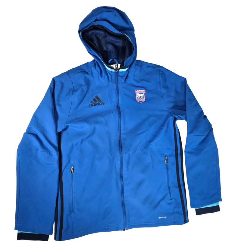 Ipswich Town football track jacket by adidas, featuring a blue design with full zip front, zip pockets, club crest and adidas branding. Ideal for training, matchdays or everyday wear.