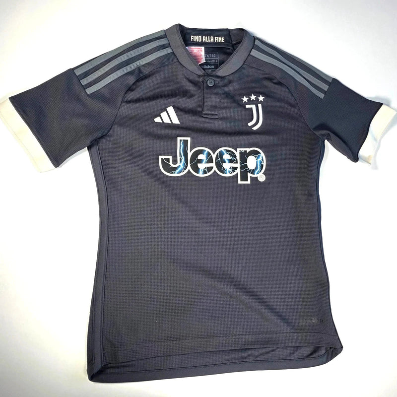 Genuine adidas Juventus third shirt from the 2023/24 season. Sleek dark grey design with off-white cuffs, featuring the iconic Jeep sponsor with electric blue detailing, adidas logo, and Juventus crest with three stars.