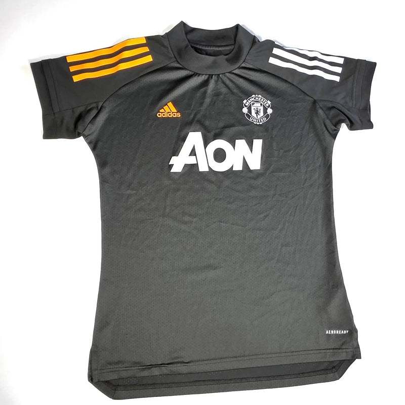 The Adidas Manchester United 2020/21 Training Football Shirt in AON is a grey shirt with short sleeves, designed for children aged 4-6 years.