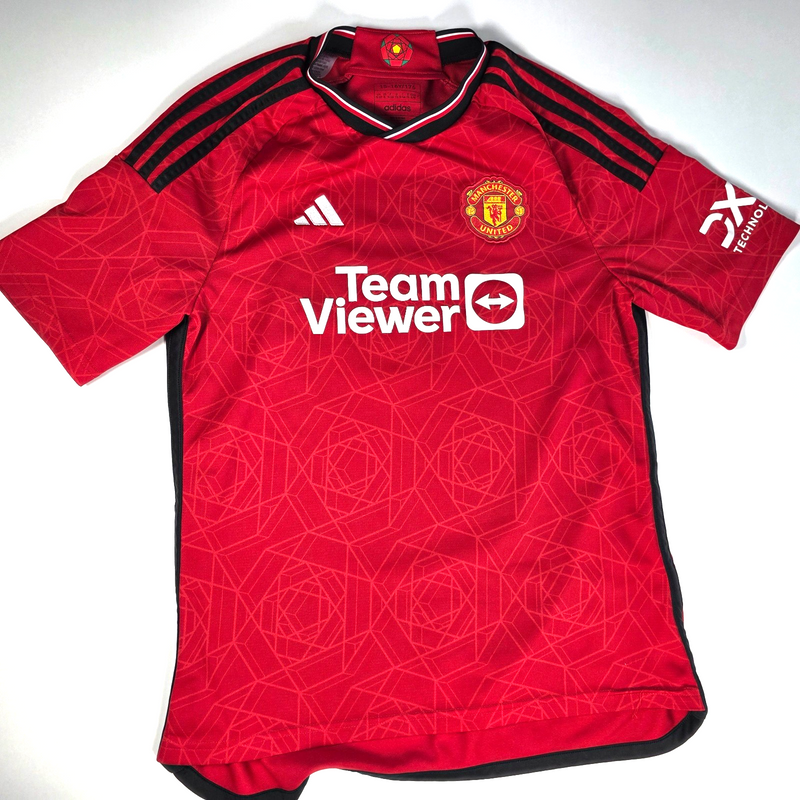 Official Adidas Manchester United home shirt from the 2023/24 season. Features the classic red design with subtle geometric pattern, club crest, and TeamViewer sponsor.