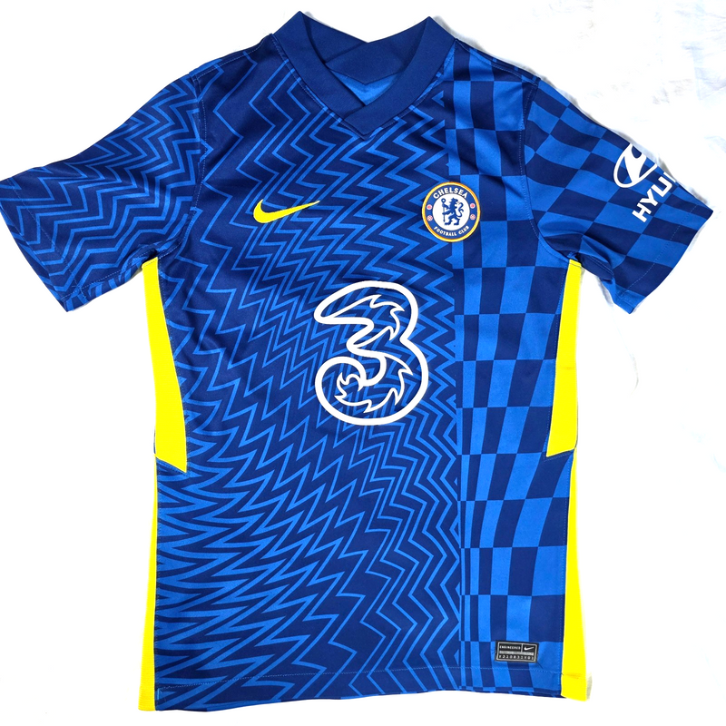 This official Nike Chelsea FC home shirt features the bold 2021/22 zig-zag and checkerboard design, club crest, and sponsor detailing — perfect for young Blues fans and collectors.