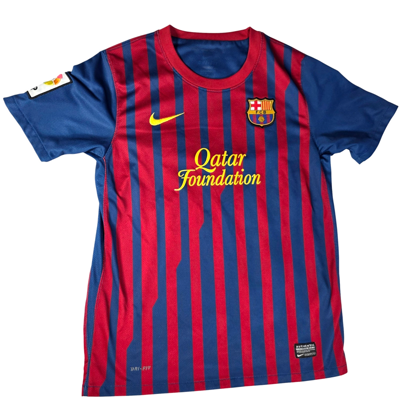 FC Barcelona home shirt from the 2011 to 2012 season by Nike, featuring the classic blue and red vertical stripe design with Qatar Foundation sponsor and embroidered club crest. A sought after Barca jersey from a memorable era, ideal for young fans or collectors.