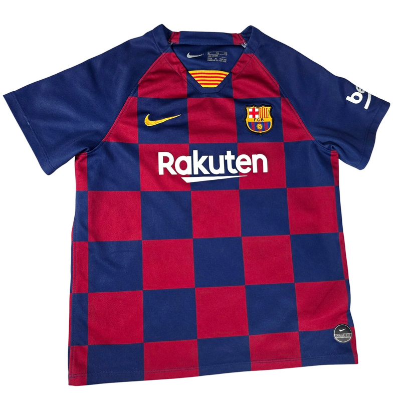 FC Barcelona home shirt from the 2019 to 2020 season by Nike, featuring the distinctive blue and red chequered design with Rakuten sponsor, embroidered club crest and La Liga sleeve badge. A standout Barca jersey suitable for match days, training or everyday wear.