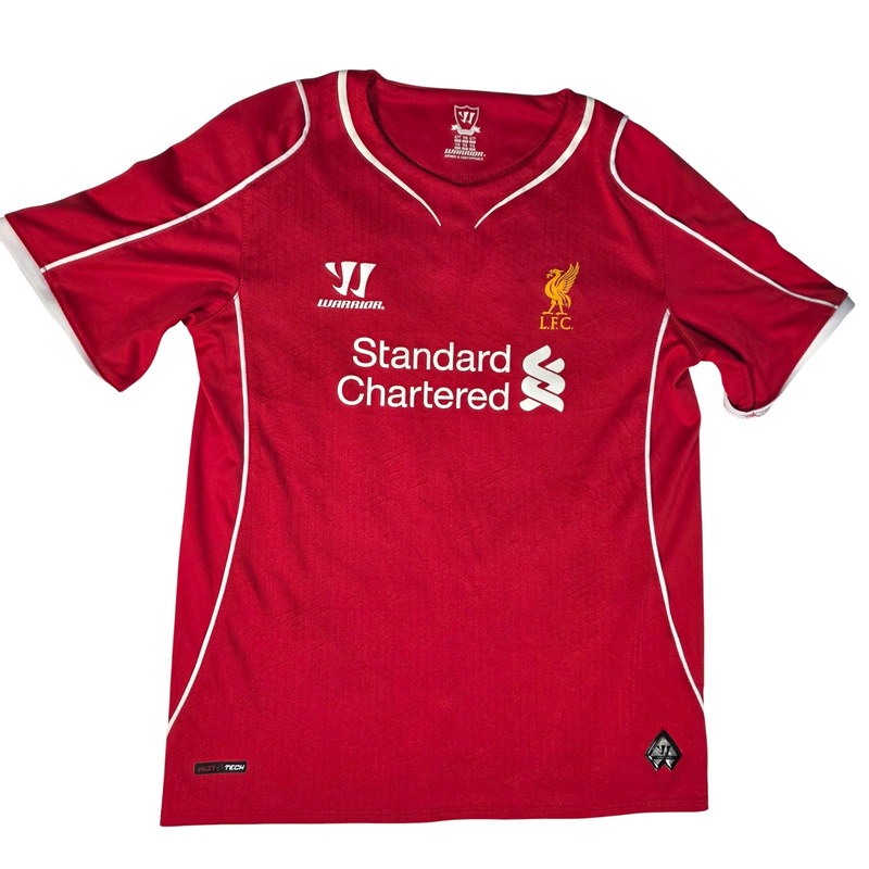 Liverpool FC 2014/15 Home Football Shirt by Warrior. Classic red design with white trim, featuring the Liverpool crest and Standard Chartered sponsor across the front.