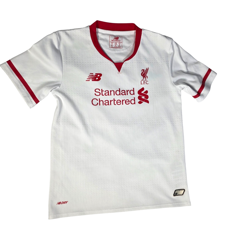 Liverpool FC 2015/16 Away Football Shirt by New Balance. White design with red trim, featuring the Liverpool crest and Standard Chartered sponsor across the front.