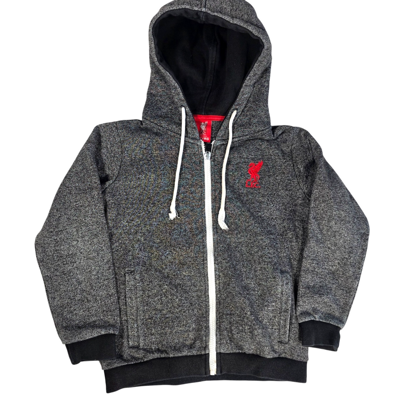 Liverpool FC Full Zip Hoodie with embroidered LFC crest on chest. Stylish grey marl design with contrast black lining, white zip and drawstrings, perfect for everyday wear or matchday support.
