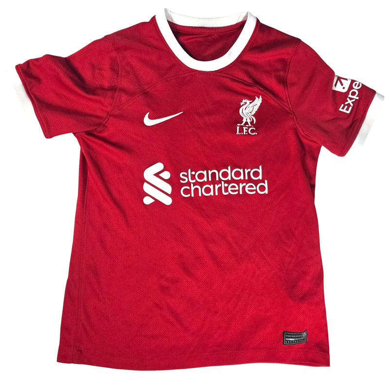 Liverpool FC 2023/24 Home Football Shirt by Nike. Red home jersey featuring Nike swoosh, Liverpool crest, Standard Chartered sponsor and Salah #11 on the back.