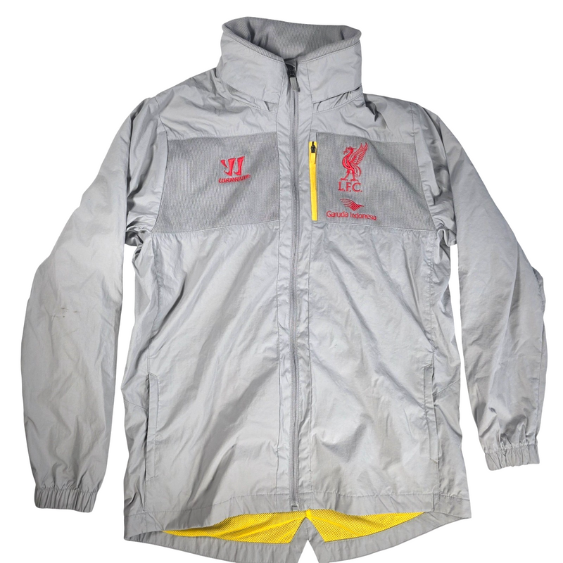 Official Liverpool FC Warrior windbreaker jacket featuring embroidered crest and sponsor logo. Lightweight and water-resistant with yellow inner lining, ideal for outdoor training or everyday wear. Has a couple of small marks.