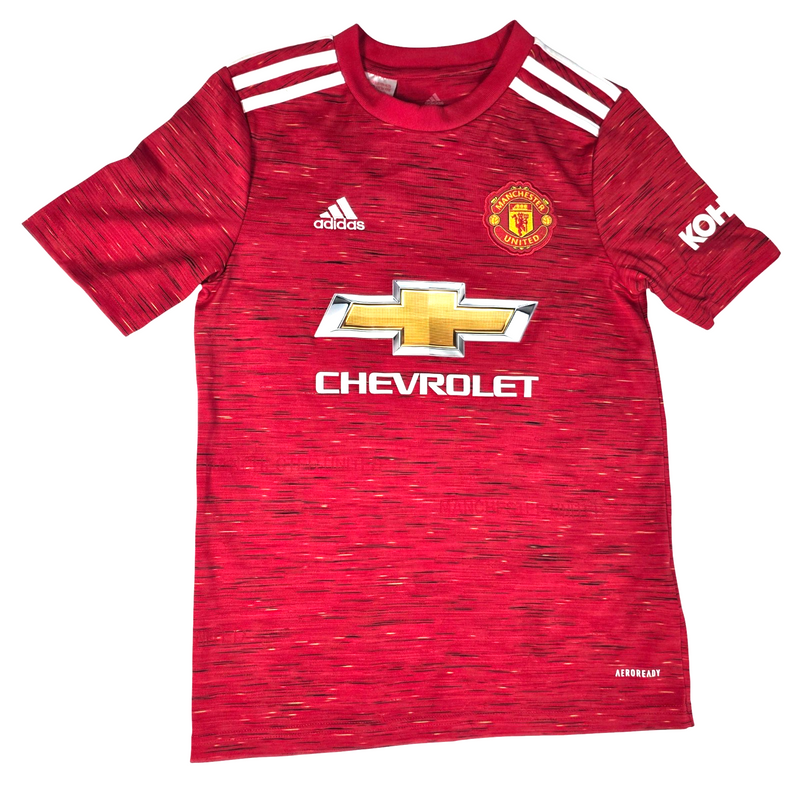Official adidas Manchester United Home Shirt for the 2020/21 season featuring the iconic red pattern design with Chevrolet sponsor and white adidas stripes on the shoulders. Made with AEROREADY fabric for lightweight comfort.