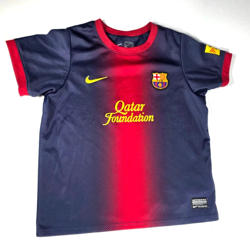 Official Nike FC Barcelona home shirt from the 2012/13 season, featuring the Qatar Foundation sponsor, embroidered club crest, and classic red/blue gradient design. Authentic Nike product with lightweight Dri-Fit material for comfort.