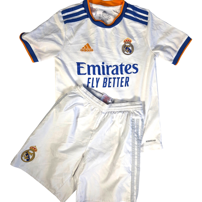 Real Madrid home football kit from the 2021 to 2022 season by adidas, featuring the classic white design with subtle detailing, Emirates sponsor and embroidered club crest. Includes the matching shirt and shorts, ideal for match days or everyday wear.