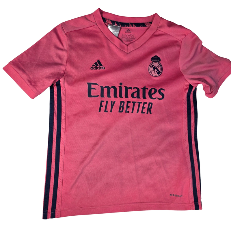 Real Madrid away shirt from the 2020 to 2021 season by adidas, featuring the distinctive pink design with black detailing, Emirates Fly Better sponsor and embroidered club crest. A standout Real Madrid jersey ideal for match days, training or everyday wear.