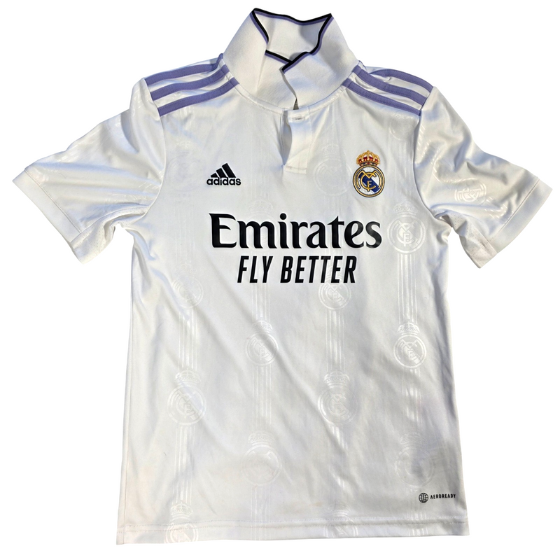 Real Madrid 2022/23 home football shirt by adidas, featuring the classic white design with subtle club pattern, fold-over collar, Emirates Fly Better sponsor and embroidered club crest. Perfect for matchdays, training or everyday wear.