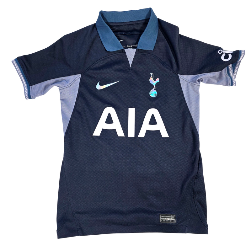 Tottenham Hotspur away football shirt by Nike from the 2023/24 season, featuring the dark navy design with contrasting sleeve panels, AIA sponsor, Nike swoosh and Spurs club crest. Ideal for matchdays, football training or casual wear.